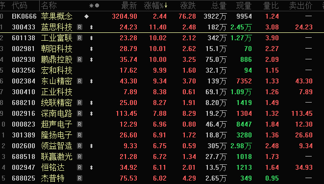今日果链板块放量高开高走,板块指数创近3个月来新高。蓝思科技、工业富联、立讯精密等千亿市值“大象”随风起舞,截至收盘,蓝思科技、立讯精密分别涨11.4%、5.45%,工业富联、朝阳科技、新亚电子、宏和科技涨停,铂力特、宜安科技、硕贝德、精研科技等涨幅居前。