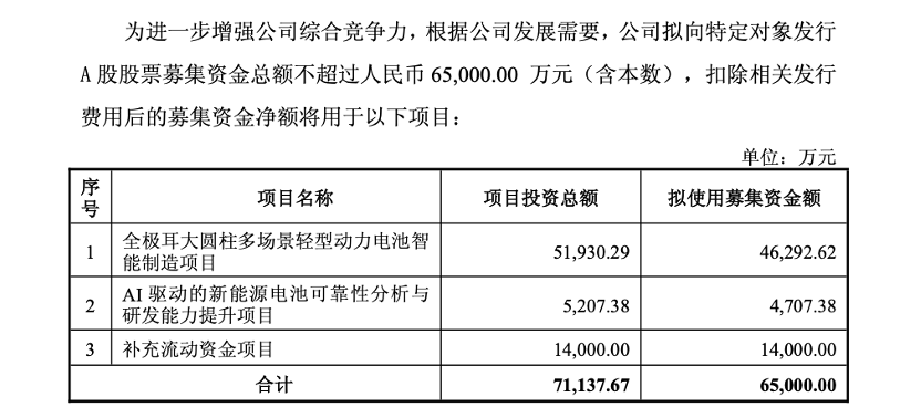 本次募集资金在扣除相关发行费用后,将主要用于“全极耳大圆柱多场景轻型动力电池智能制造项目”、“AI驱动的新能源电池可靠性分析与研发能力提升项目”以及补充公司流动资金。
