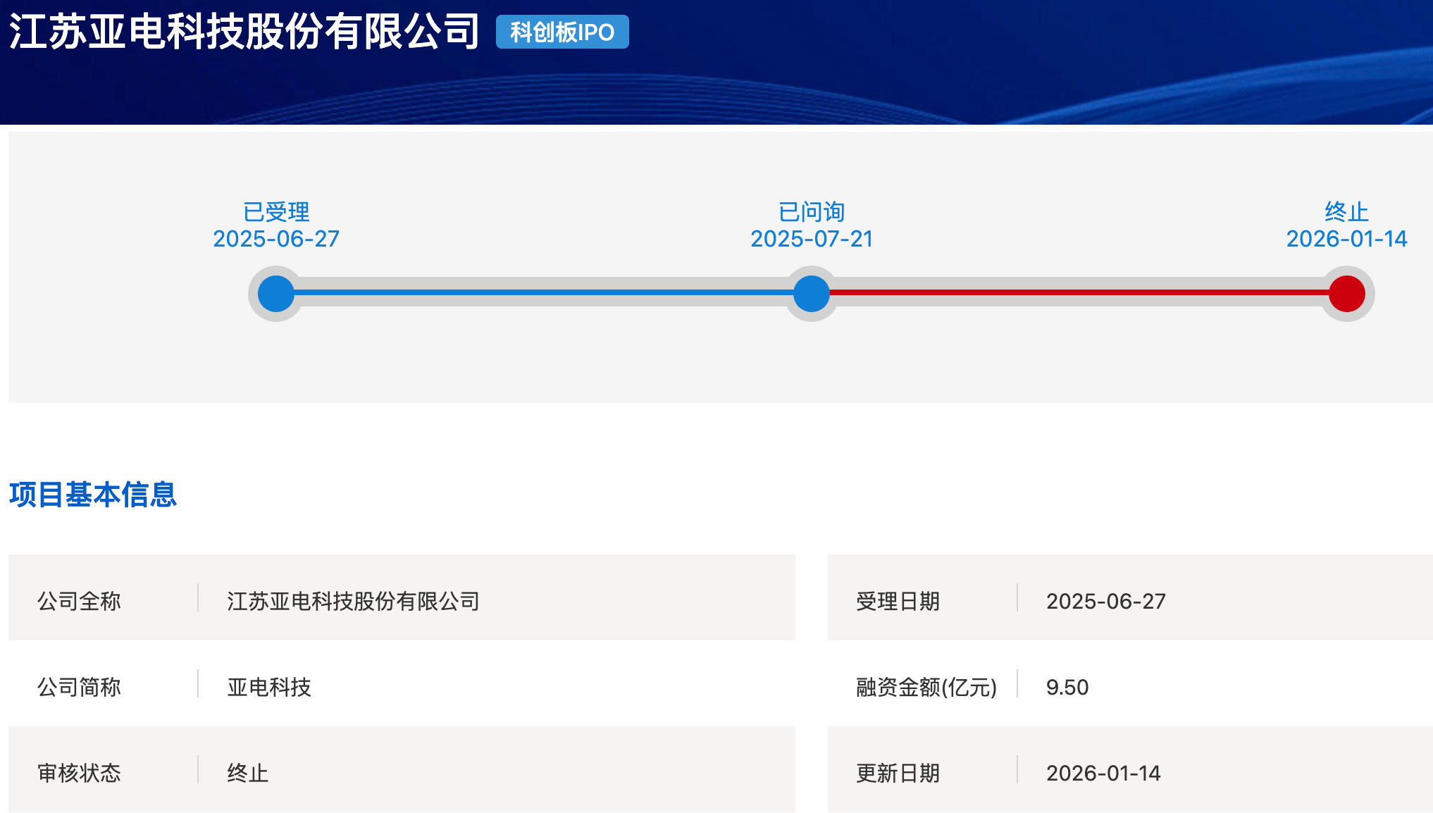 1月14日,上交所公告,因江苏亚电科技股份有限公司(简称“亚电科技”)及其保荐人撤回发行上市申请。根据有关规定,上交所终止其发行上市审核。