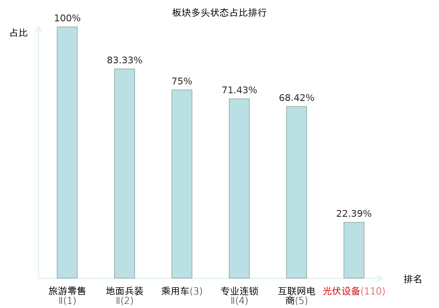 全市场所有行业板块中主力多头状态占比排名中,旅游零售Ⅱ板块位居第一。其他家电Ⅱ板块名次提升最快,较昨日上升55位。