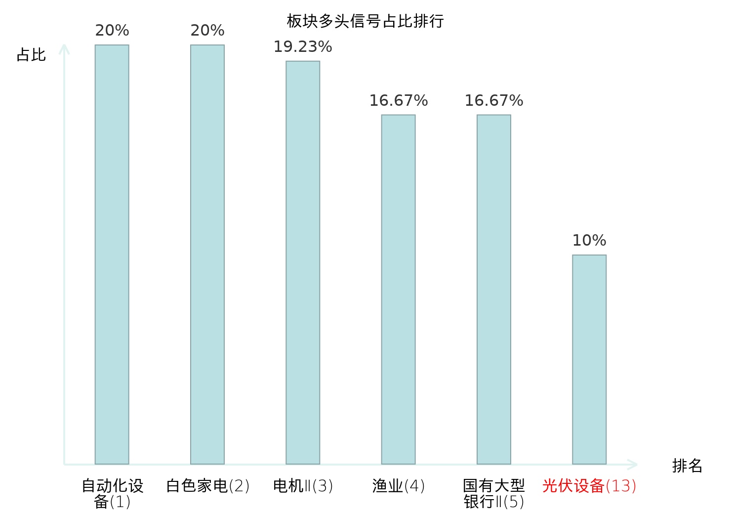 全市场所有行业板块中主力多头信号占比排名中,自动化设备板块位居第一。渔业板块名次提升最快,较昨日上升118位。