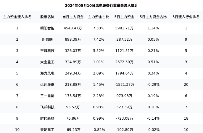 三一重能今日净流入173.54万元,主力占比2.23%,在行业内排名:7/27;5日净流入973.93万元,主力占比0.19%,在行业内排名:6/27。