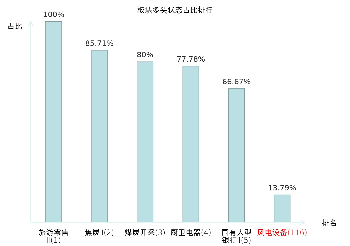 全市场所有行业板块中主力多头状态占比排名中,旅游零售Ⅱ板块位居第一。渔业板块名次提升最快,较昨日上升66位。