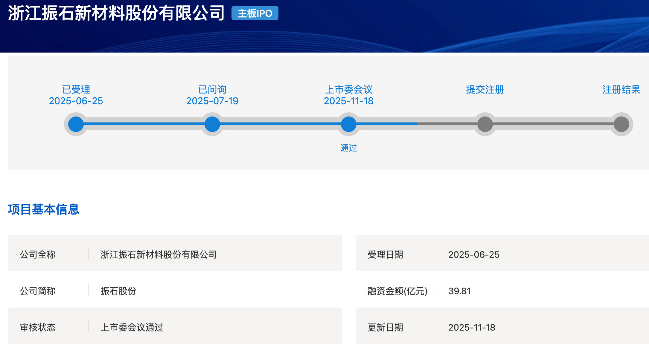 11月18日,上交所召开2025年第55次上市审核委员会审议会议,审核浙江振石新材料股份有限公司(简称“振石股份”)首发事项,最终公司顺利过会。