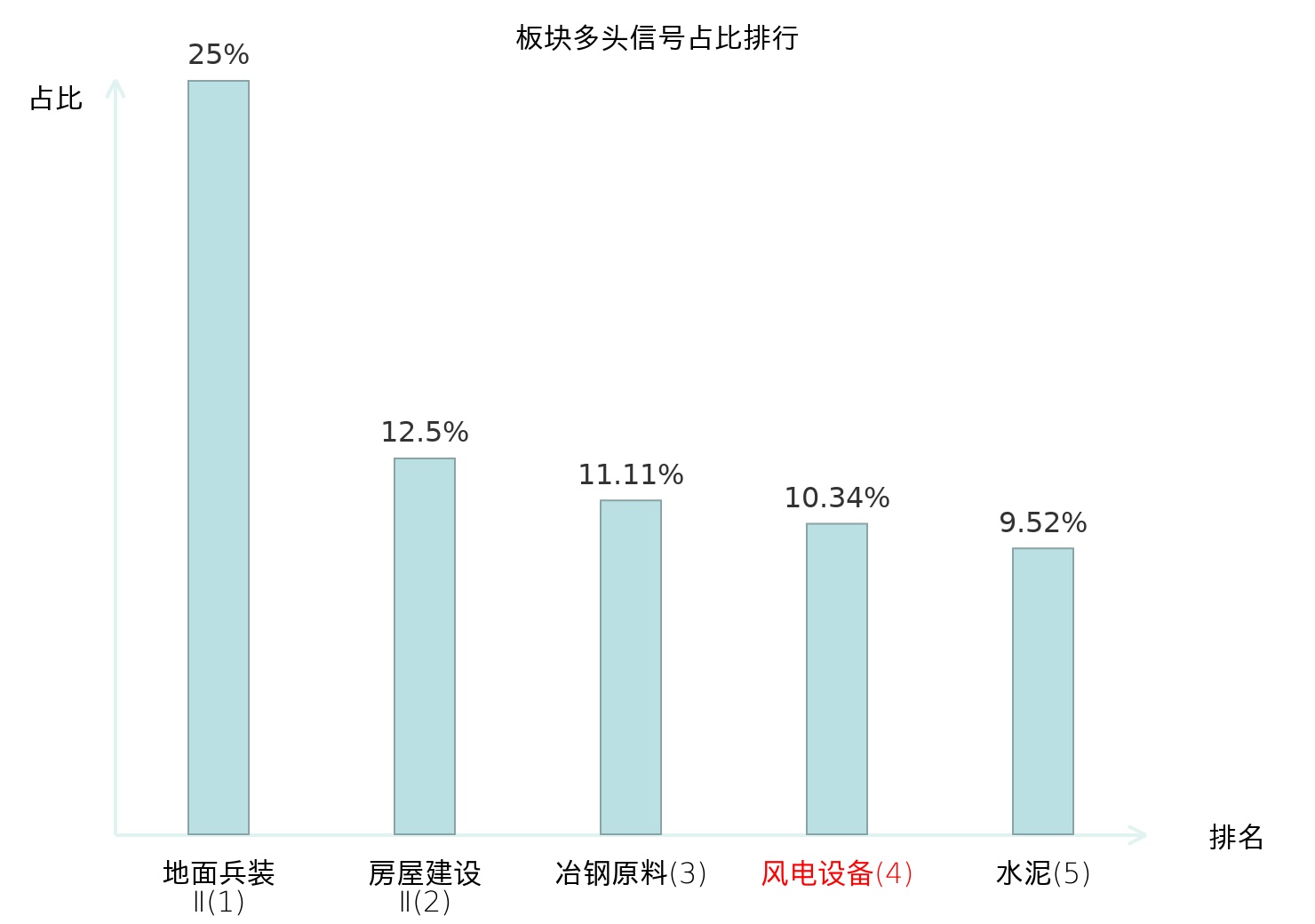 全市场所有行业板块中主力多头信号占比排名中,地面兵装Ⅱ板块位居第一。房屋建设Ⅱ板块名次提升最快,较昨日上升117位。