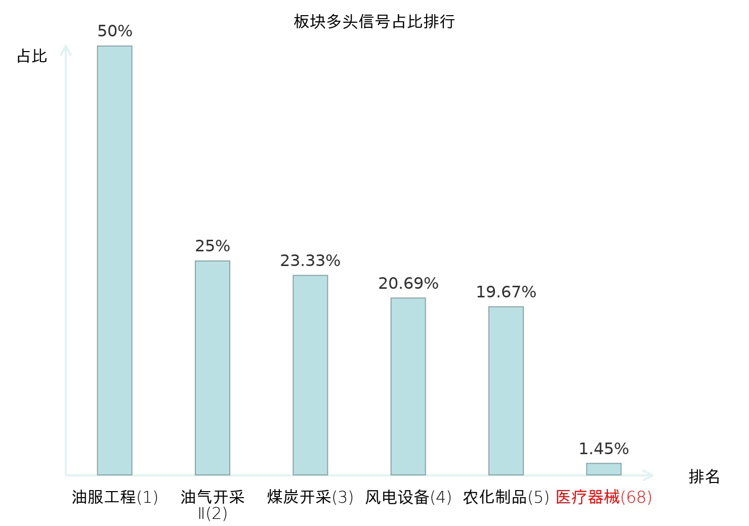 全市场所有行业板块中主力多头信号占比排名中,油服工程板块位居第一。油气开采Ⅱ板块名次提升最快,较昨日上升125位。