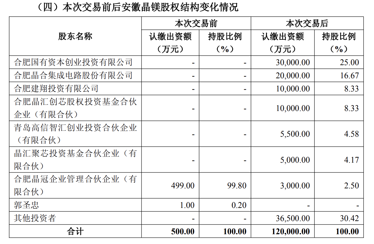 在投资方对安徽晶镁增资完成后,该公司第一大股东将为合肥国有资本创业投资有限公司(下称“合肥国投”)。合肥国投为合肥市建设投资控股(集团)有限公司持股100%持股企业。