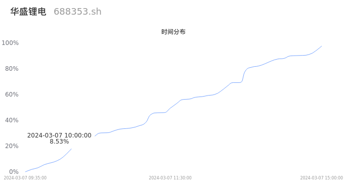 688353华盛锂电2024年03月07日成交4112手,成交金额977.67万元,相较昨日缩量712手,换手率0.67%,成交清淡。