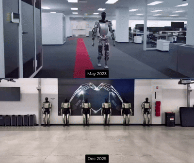 对于Optimus的跑姿,有券商点评称,这是Optimus第一次真正意义上的“奔跑”。根据画面估算,Optimus的速度大约在2.5-3米/秒,已经接近人类慢跑的速度。更令人震撼的是它的步态:重心转移顺畅、脚掌着地到蹬地一气呵成,双臂自然前后摆动,甚至在加速阶段还能看到膝关节和踝关节的弹性弯曲与伸展。