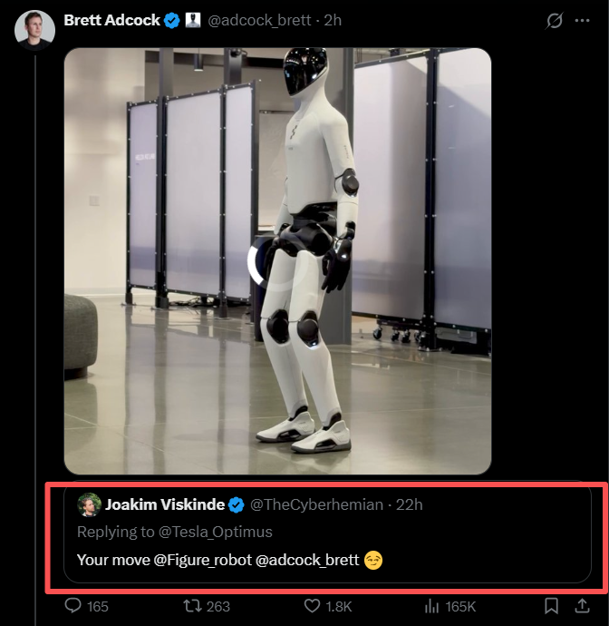 事件的起因是,昨日特斯拉在社交平台X转发Optimus 2.5的跑步视频并配文称:刚在实验室刷新了个人纪录(PR,Personal Record)。当时,平台用户Joakim Viskinde在下方评论区@Figure官方账号称:“该你出招了。”随后不到20小时,阿德科克便用一段视频进行了回应。