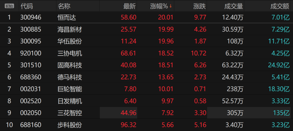 受上述消息影响,今日A股机器人产业链闻风而动。截至发稿,海昌新材、华伍股份、巨轮智能等多股涨停,固高科技、德马科技、三花智控等纷纷走高。