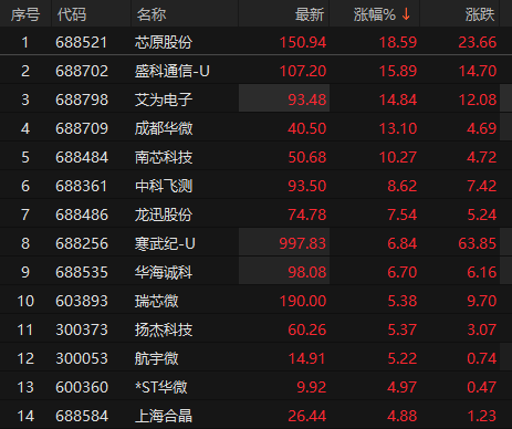 上证报中国证券网讯 8月20日午后,半导体板块震荡回升,截至13时42分,芯原股份涨超18%,成交额超30亿元。成都华微、盛科通信、艾为电子、南芯科技涨超10%,中科飞测、寒武纪等跟涨。