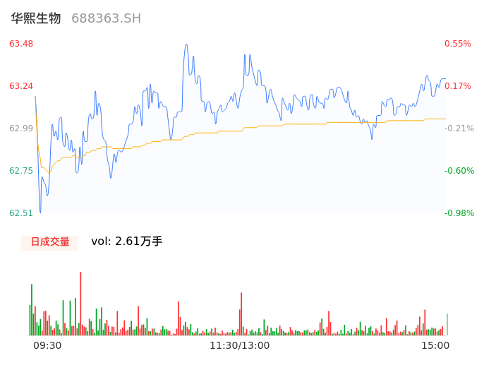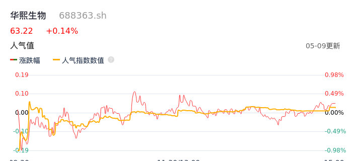 05月09日,华熙生物收报63.22,股价涨幅0.14%,成交金额1.65亿元,换手率1.32%。