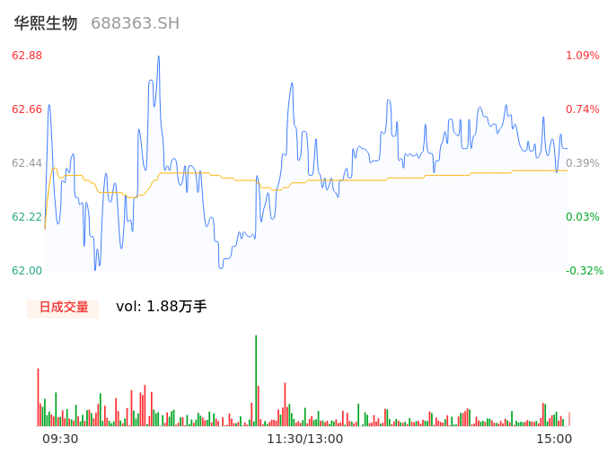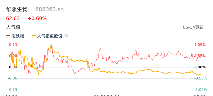 05月14日,华熙生物收报62.63,股价涨幅0.69%,成交金额1.17亿元,换手率0.95%。