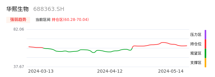 我们来看一下该股的九方特色指标强弱趋势的情况:华熙生物自04月22日从观望区上穿到持仓区。股价近期在多头区域持续强势上扬,上升动能仍较为充足,可积极关注。后续重点关注上方压力位:70.04元是否能突破上攻。