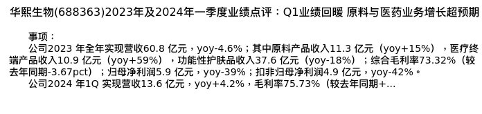 值得注意的是:2024年05月华创证券的王薇娜/姚婧分析师,首次发布关于华熙生物的研究报告,标题为:华熙生物(688363)2023年及2024年一季度业绩点评:Q1业绩回暖 原料与医药业务增长超预期。