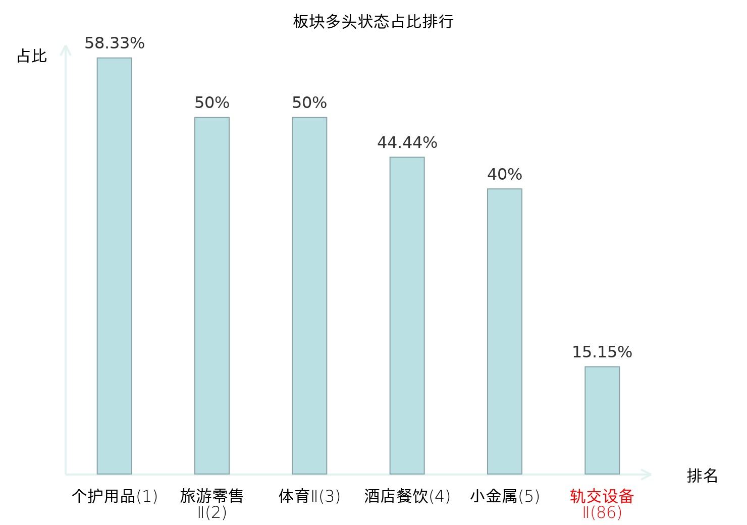全市场所有行业板块中主力多头状态占比排名中,个护用品板块位居第一。乘用车板块名次提升最快,较昨日上升87位。