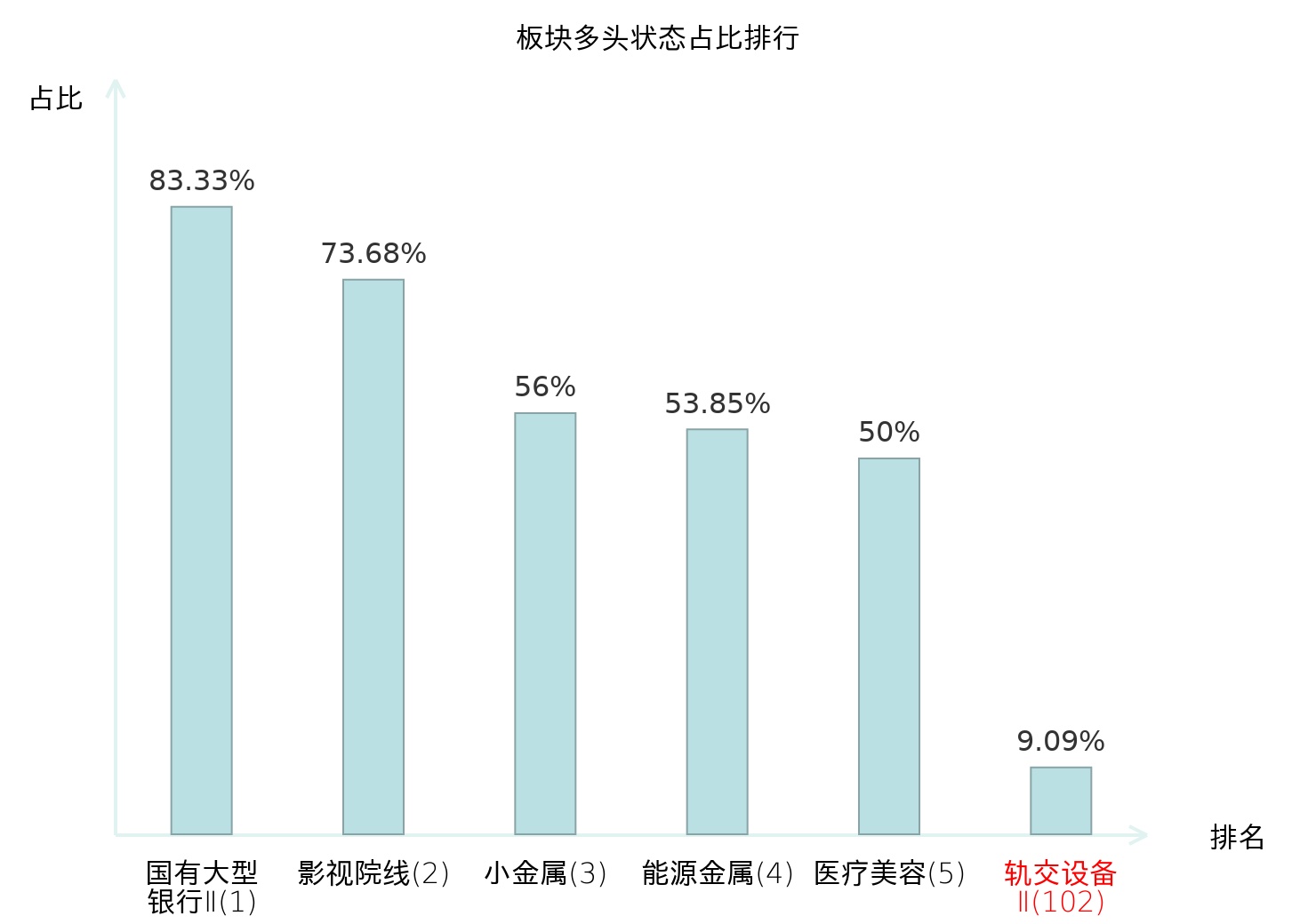 全市场所有行业板块中主力多头状态占比排名中,国有大型银行Ⅱ板块位居第一。电视广播Ⅱ板块名次提升最快,较昨日上升99位。