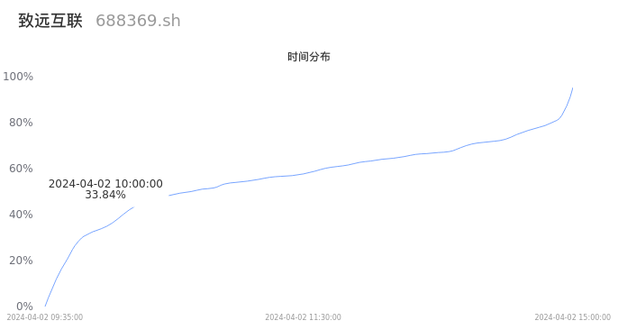 根据成交分布分析,该股票当天放量成交,成交清淡。时间上看,早盘前半小时成交量占据当天总成交量的33.84%;价格上看,成交呈现中间峰。成交分布分析主要研究股票成交的分布特性,不具有预测功能,请知悉。