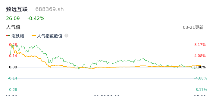 03月21日,致远互联收报26.09,股价涨幅-0.42%,成交金额3.16亿元,换手率10.04%。