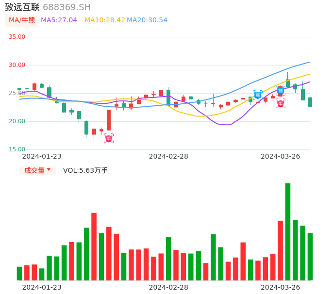 03月26日,致远互联收报22.57,股价涨幅-4.97%,成交金额1.29亿元,换手率4.89%。