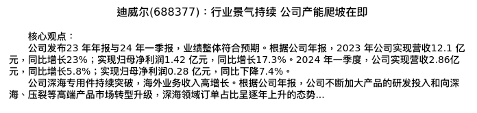 值得注意的是:2024年05月广发证券的代川/汪家豪分析师,首次发布关于迪威尔的研究报告,标题为:迪威尔(688377):行业景气持续 公司产能爬坡在即。