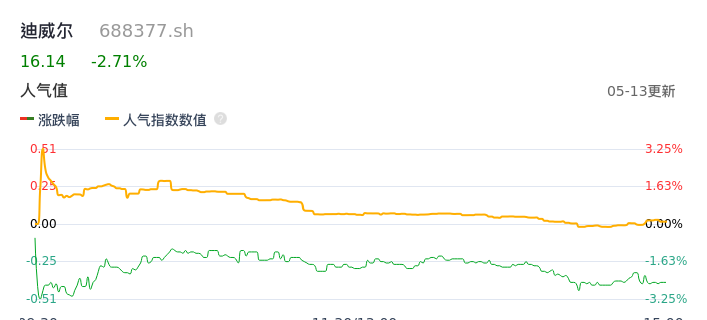05月13日,迪威尔收报16.14,股价涨幅-2.71%,成交金额2373.46万元,换手率0.75%。