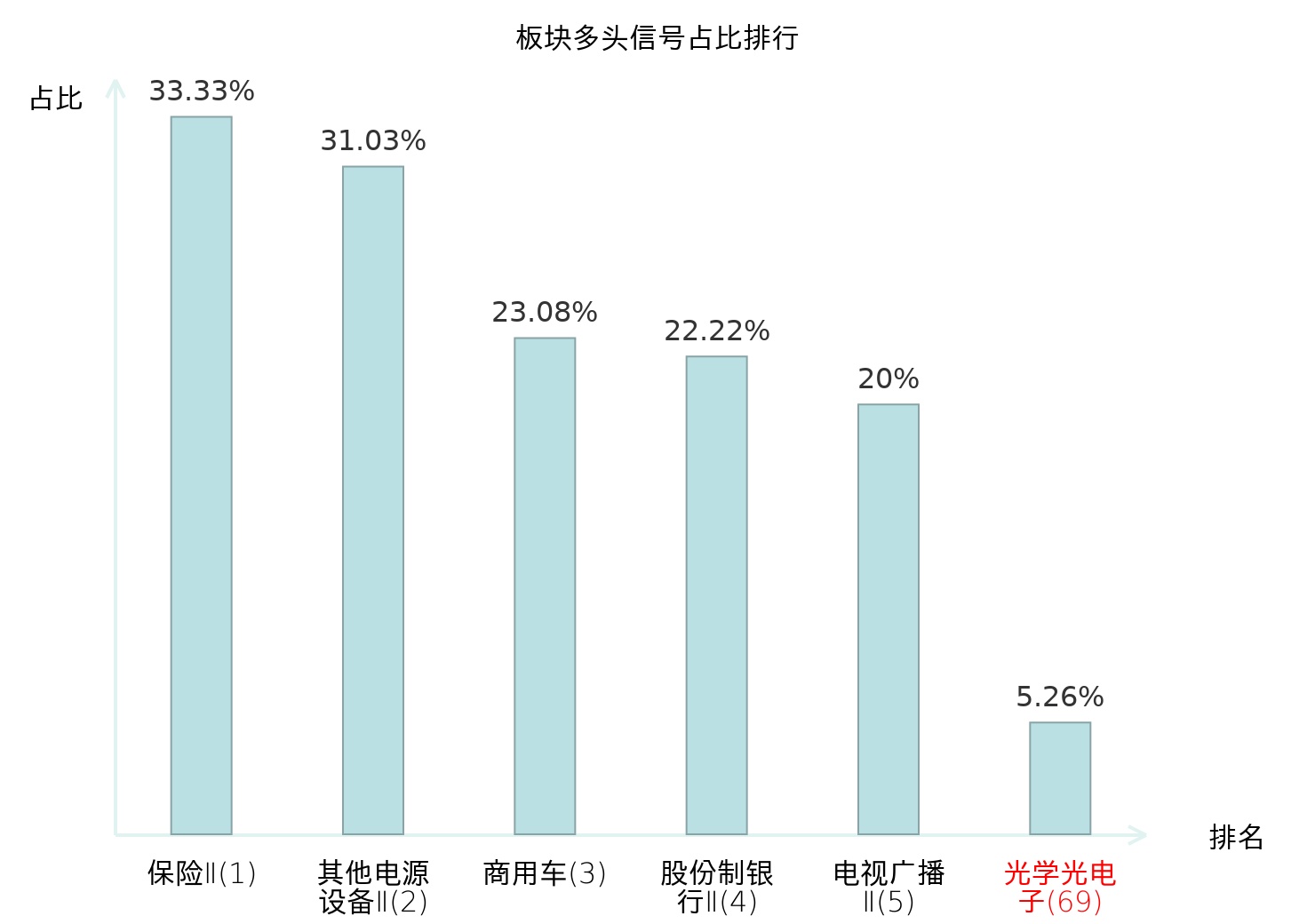 全市场所有行业板块中主力多头信号占比排名中,保险Ⅱ板块位居第一。股份制银行Ⅱ板块名次提升最快,较昨日上升119位。