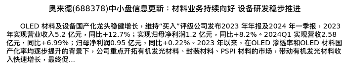 值得注意的是:2024年05月开源证券的任浪/周佳分析师,首次发布关于奥来德的研究报告,标题为:奥来德(688378)中小盘信息更新:材料业务持续向好 设备研发稳步推进。