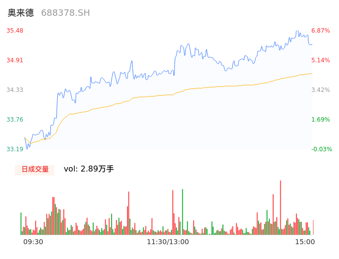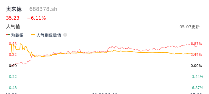 05月07日,奥来德收报35.23,股价涨幅6.11%,成交金额1.00亿元,换手率2.01%。