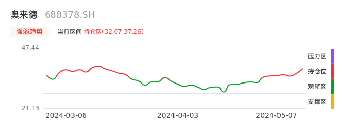 我们来看一下该股的九方特色指标强弱趋势的情况:奥来德自04月24日从观望区上穿到持仓区。股价近期在多头区域持续强势上扬,上升动能仍较为充足,可积极关注。后续重点关注上方压力位:37.26元是否能突破上攻。
