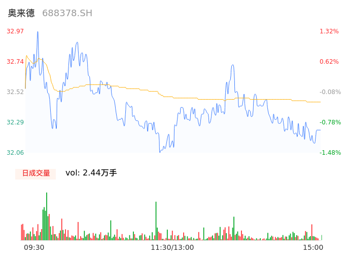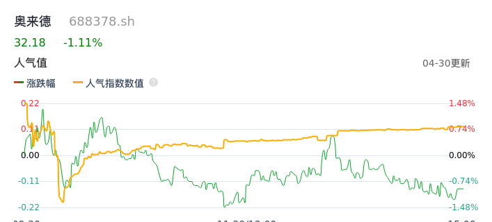 04月30日,奥来德收报32.18,股价涨幅-1.11%,成交金额7917.49万元,换手率1.70%。