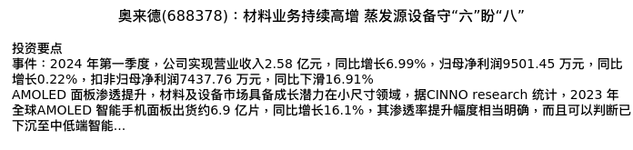值得注意的是:2024年04月浙商证券的王凌涛/沈钱/周艺轩分析师,首次发布关于奥来德的研究报告,标题为:奥来德(688378):材料业务持续高增 蒸发源设备守“六”盼“八”。