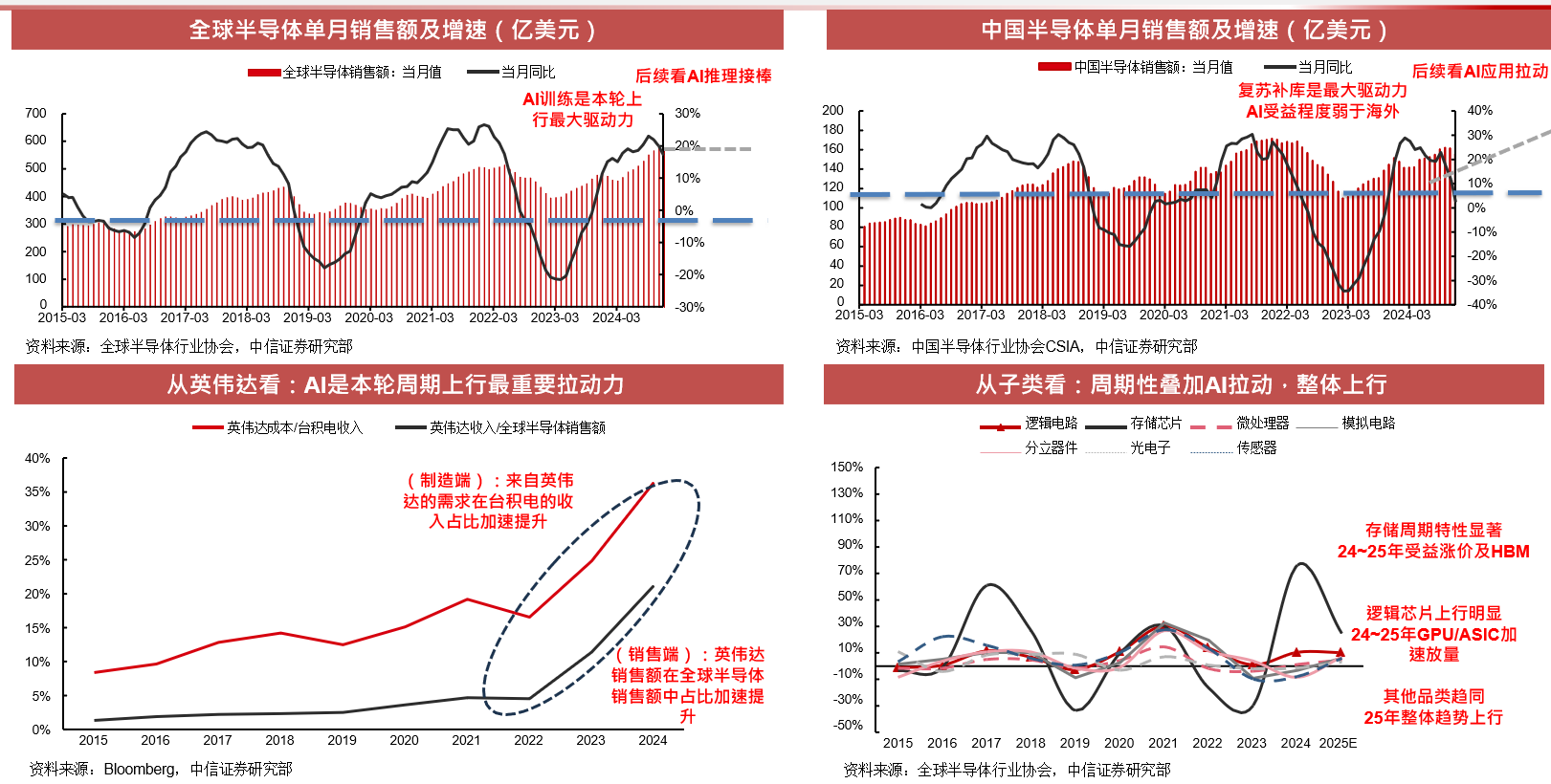 综合来看,行业整体在2023年触底、24年进入盈利修复和增长通道。2024年起制造、封测、设计均在逐步修复,从增长的节奏和幅度来看,芯片设计和设备领跑,净利率半导体设备板块较高;股价走势方面,数字芯片设计和制造板块表现最强。
