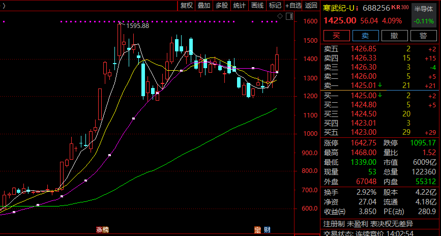 上证指数一度震荡翻红。板块方面,算力芯片概念震荡走强,寒武纪(688256)盘中一度涨超7%,总市值重返6000亿元上方,不过,截至发稿,该股有所回落,成交额超180亿元。海光信息、芯原股份、复旦微电、云天励飞等冲高。