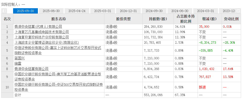 股权结构方面,截至今年三季度末,复旦微电前十大股东占总股本持股比例为67.35%,中国农业银行股份有限公司-中证500交易型开放式指数证券投资基金为新进股东,持股比例0.58%。