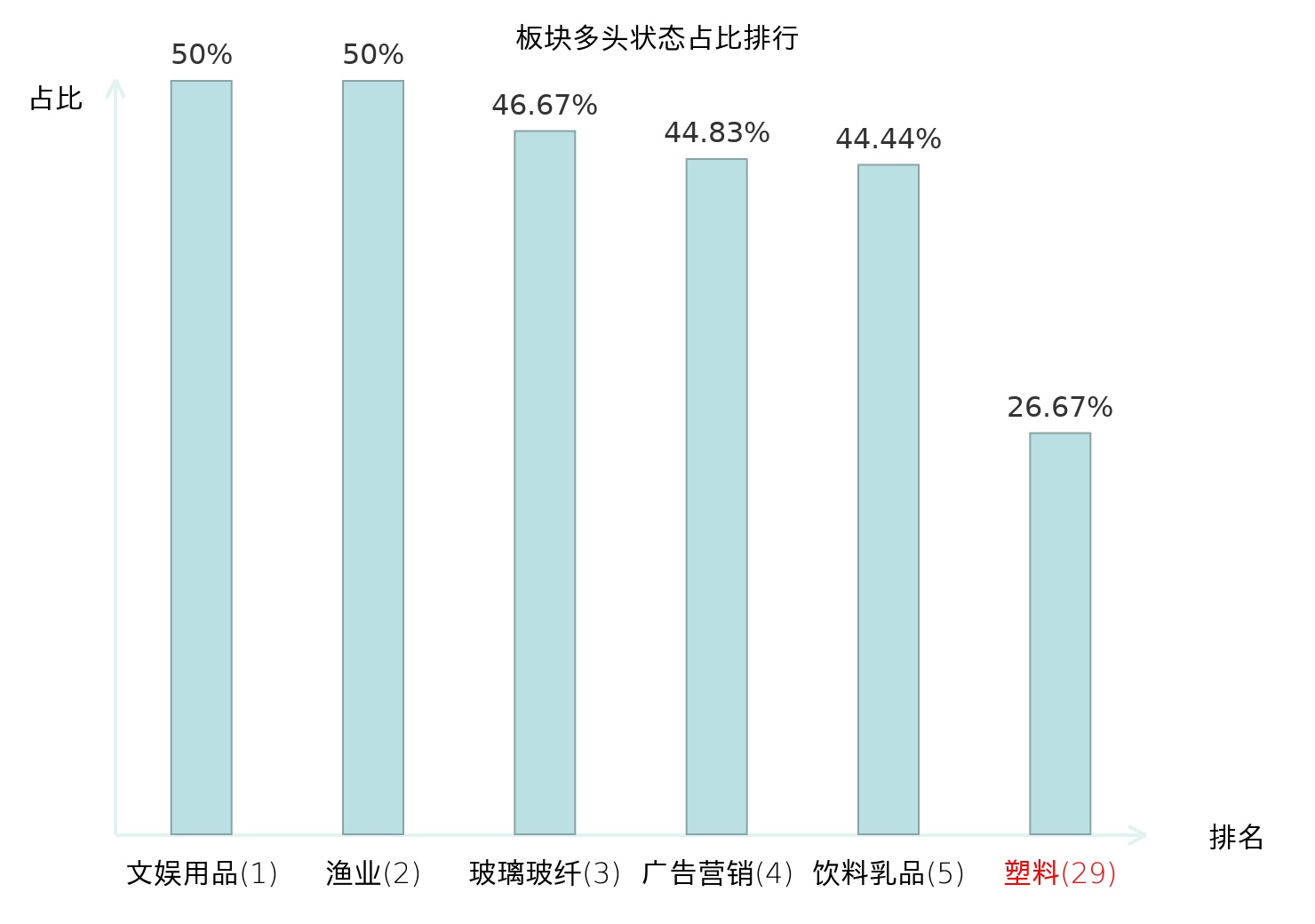 全市场所有行业板块中主力多头状态占比排名中,文娱用品板块位居第一。饮料乳品板块名次提升最快,较昨日上升59位。