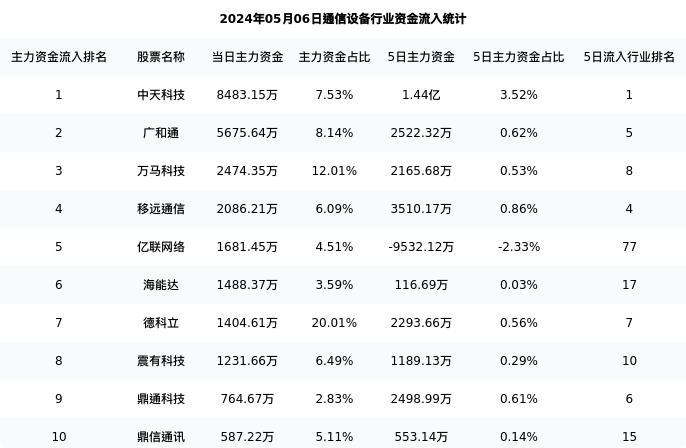 从主力资金流向来看,通信设备行业今日主力资金流入106.87亿元,在所有申万二级行业中排名:3/131。