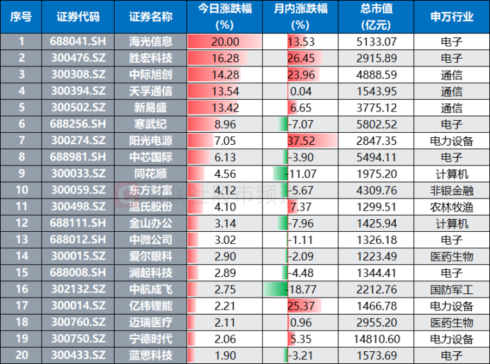 注:今日涨幅居前的千亿市值“双创股”(截至9月11日收盘)