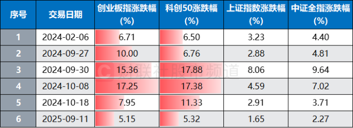 注:A股历史中创业板指、科创50指数齐涨超5%的6次行情(截至9月11日收盘)
