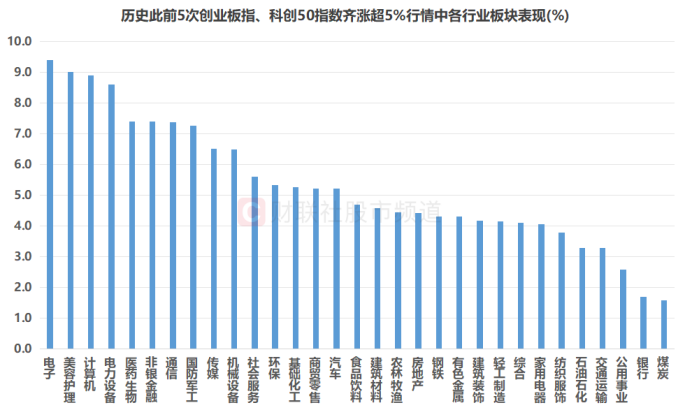 注:历史此前5次创业板指、科创50指数齐涨超5%行情中各行业板块表现(截至9月11日收盘)