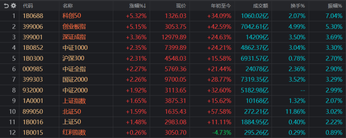 财联社9月11日讯(编辑 梓隆),今日(9月11日),市场呈现普涨格局,各大指数也拉升明显。其中,创业板指、科创50指数双双涨幅超5%,在市场主要中涨幅居前。
