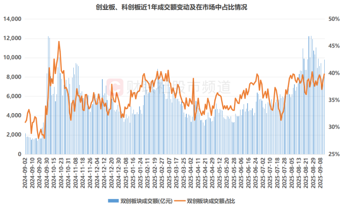注:创业板、科创板近1年成交额变动及在市场中占比情况(截至9月11日收盘)