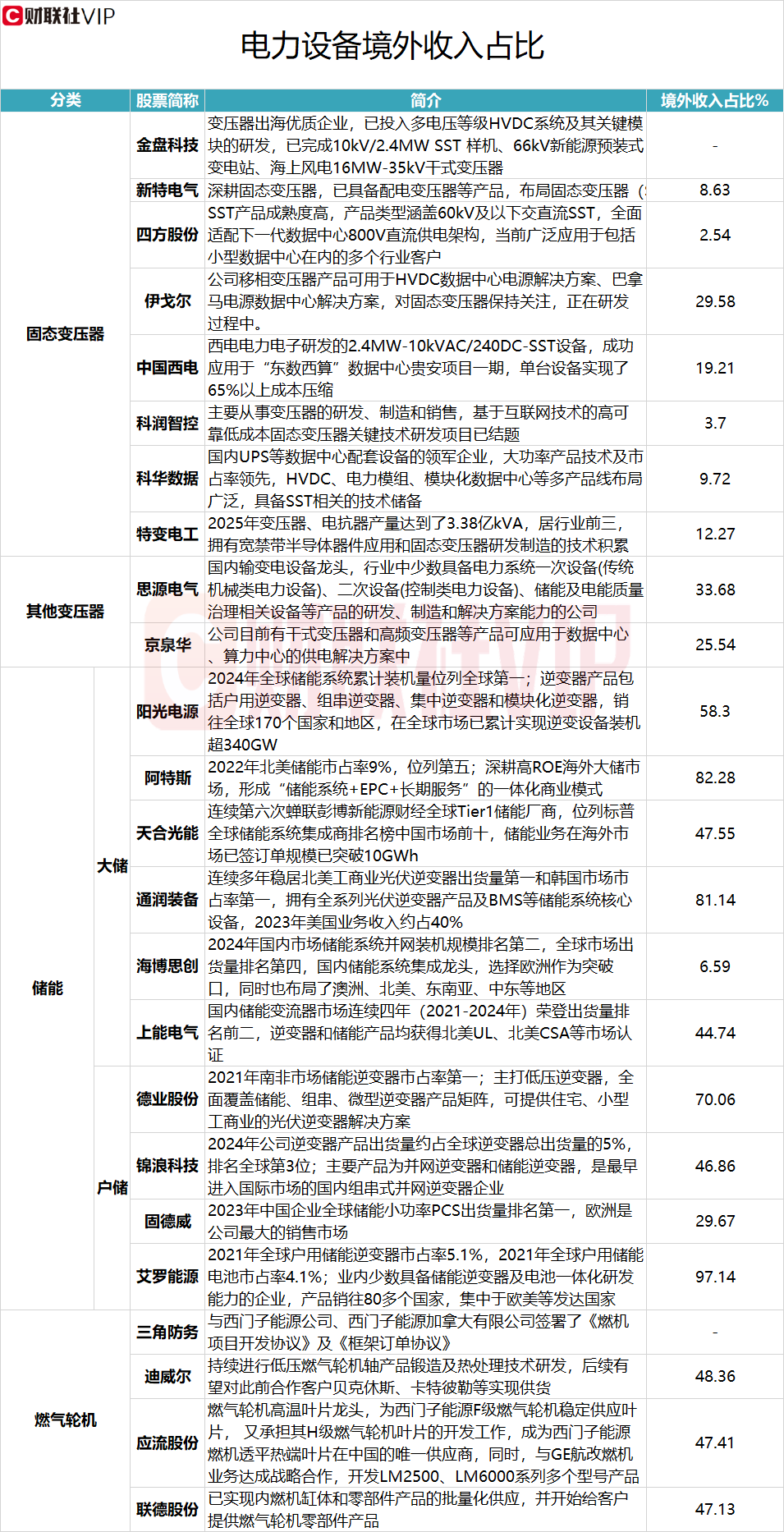 据财联社VIP数据梳理电力设备的储能环节中,大储主要包括阳光电源阿特斯天合光能通润装备海博思创上能电气等;户储主要包括德业股份锦浪科技固德威艾罗能源等境外营收占比靠前。具体情况见下图: