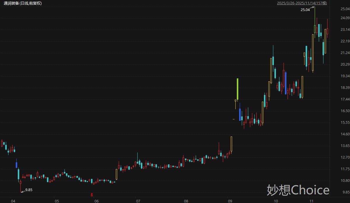 通润装备境外收入占比81.14%。公司连续多年稳居北美工商业光伏逆变器出货量第一和韩国市场市占率第一,拥有全系列光伏逆变器产品及BMS等储能系统核心设备,2023年美国业务收入约占40%。东吴证券分析师曾朵红等人10月27日研报认为,估计通润装备2025Q3逆变器出货2-3GW,展望2025Q4,为传统需求旺季叠加部分项目延至2025Q4确收,预计2025Q4业绩环比高增。二级市场方面,通润装备股价自4月低点迄今累计最大涨幅154%
