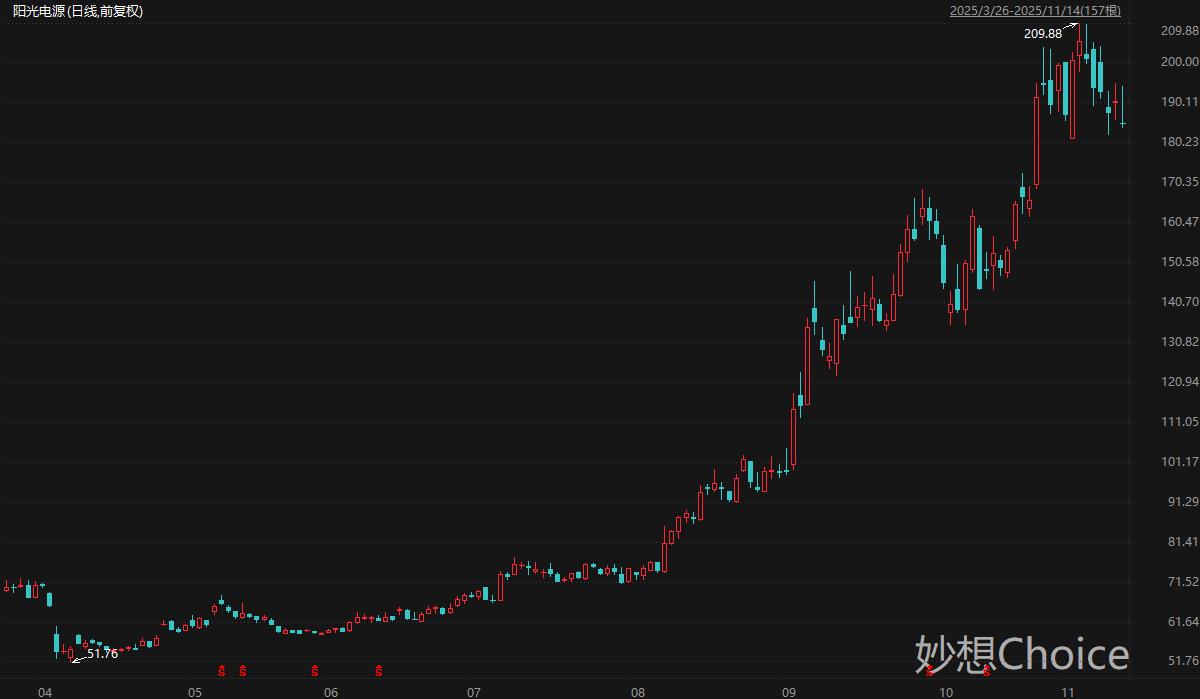 其中,阳光电源2024年全球储能系统累计装机量位列全球第一,境外收入占比58.3%。其逆变器产品包括户用逆变器、组串逆变器、集中逆变器和模块化逆变器,销往全球170个国家和地区,在全球市场已家计实现逆变设备装机超340GW。民生证券分析师邓永康等人11月2日研报认为,阳光电源2025年全年储能出货目标40-50GWh,相比2024年28GWh的发货量有望大幅提升。展望2026年,全球储能市场有望保持40-50%的高增速,阳光电源储能业务有望受益于全球储能需求的增长,保持较好的发展态势。二级市场方面,阳光电源股价自4月低点迄今累计最大涨幅305%