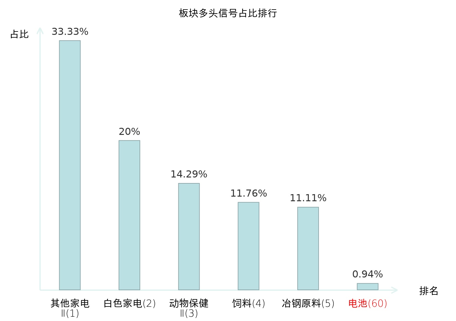 全市场所有行业板块中主力多头信号占比排名中,其他家电Ⅱ板块位居第一。其他家电Ⅱ板块名次提升最快,较昨日上升128位。
