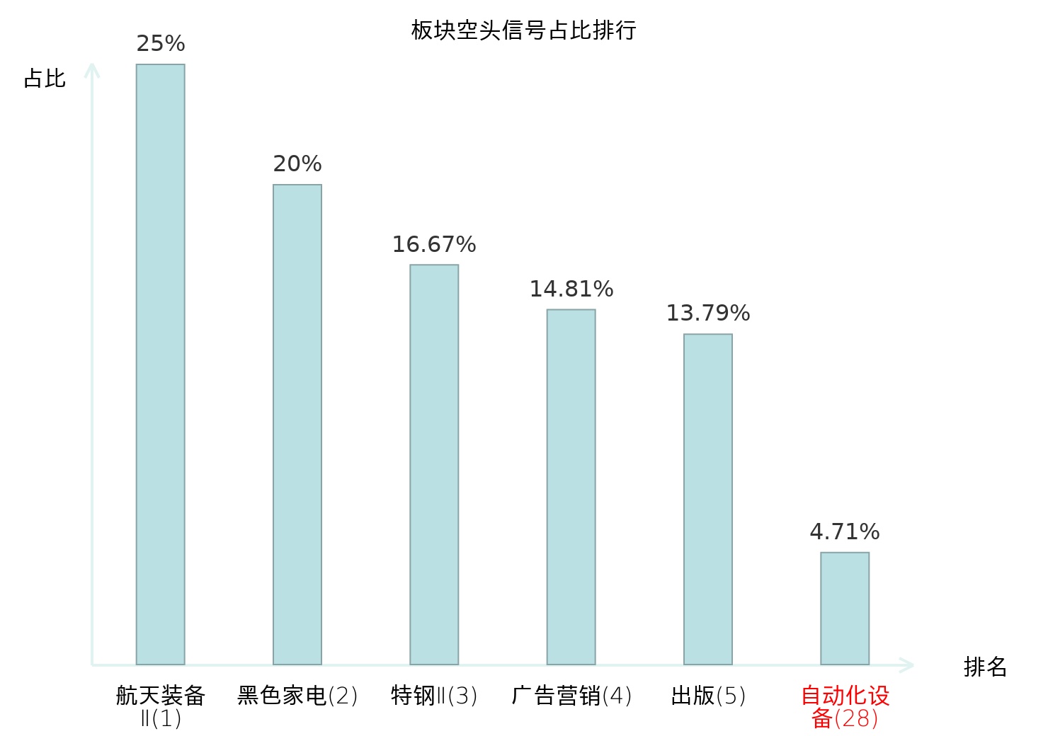 全市场所有行业板块中主力空头信号占比排名中,航天装备Ⅱ板块位居第一。软件开发板块名次提升最快,较昨日上升119位。