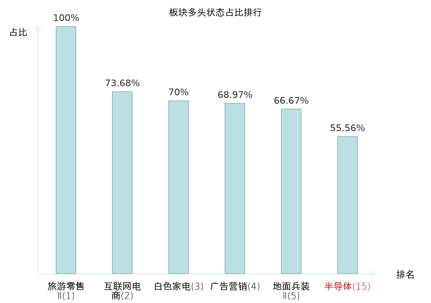 全市场所有行业板块中主力多头状态占比排名中,旅游零售Ⅱ板块位居第一。厨卫电器板块名次提升最快,较昨日上升76位。