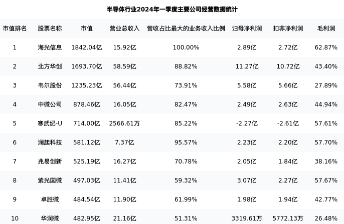 华润微最新报告期数据为一季度,下表汇总了半导体行业内市值靠前的公司一季度主要经营数据
